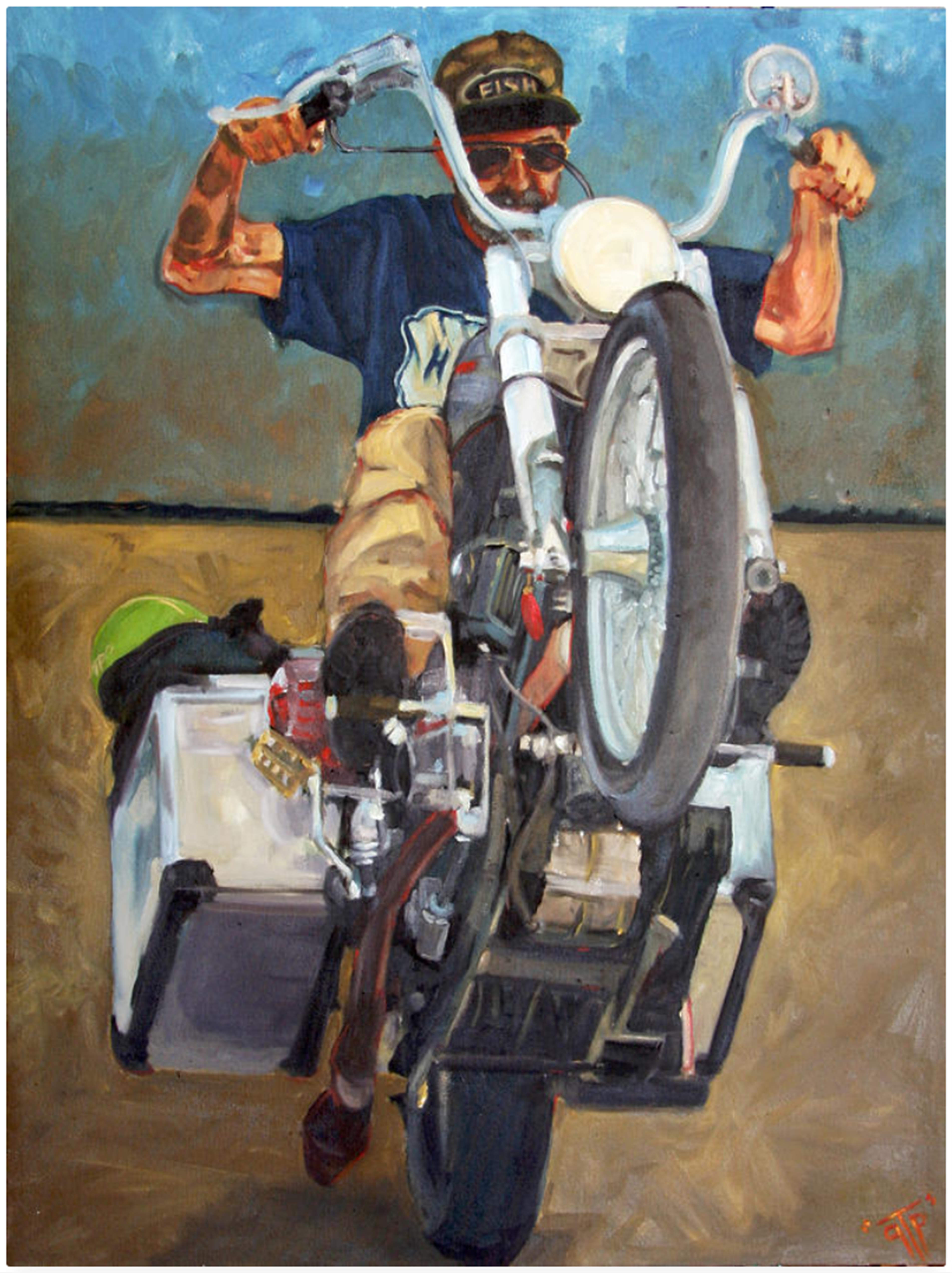 Intergalactic Attack Formation # 1 by George ‘GTP’ Frizzell. That is GTP hisself, trademark sneer in place, aboard the shovelhead he calls ‘Leaky Latowski’. He reports that the original canvas now lives in Australia.