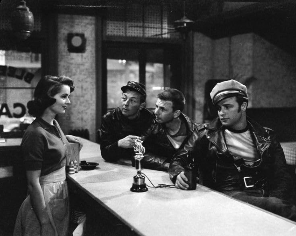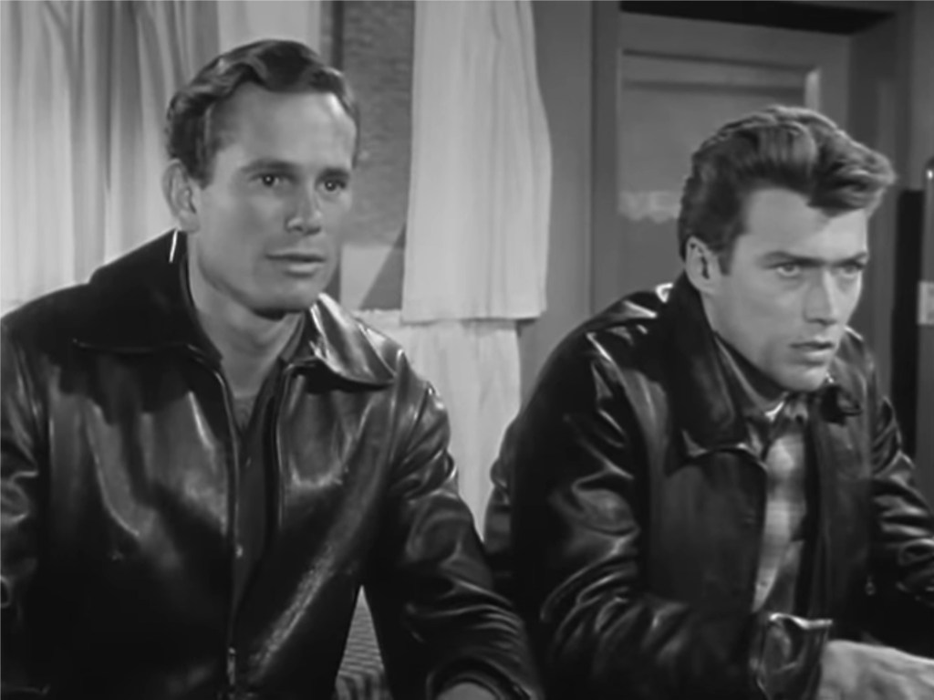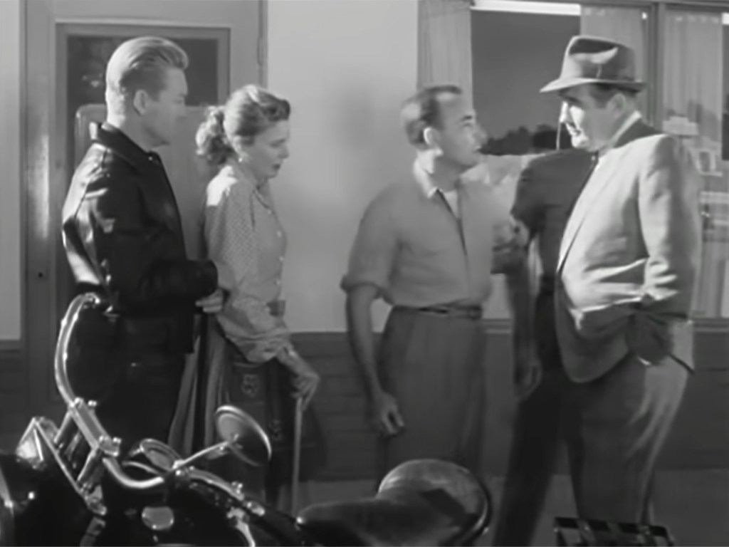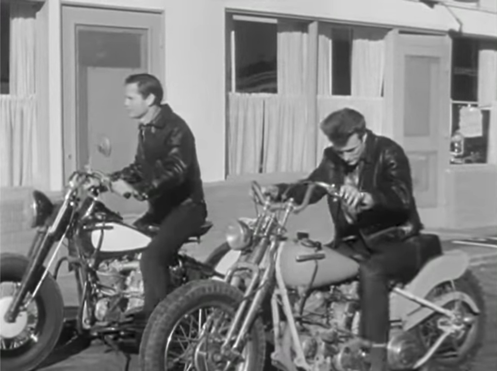 In an episode of the 1950s television show Highway Patrol, aired 2 April 1956, two motorcycle club members (Clint Eastwood as ‘Joe Keeley’ and John Compton as ‘Nick West’) ride their stripped-down Harleys into a small town and stop at a café for breakfast. They are shocked when the café owner (Jack Edwards as ‘Bernie Sills’) confronts them with a shotgun, forces them outside and orders them to leave.