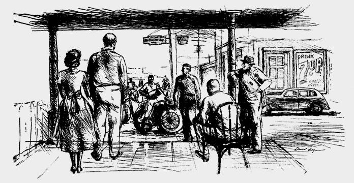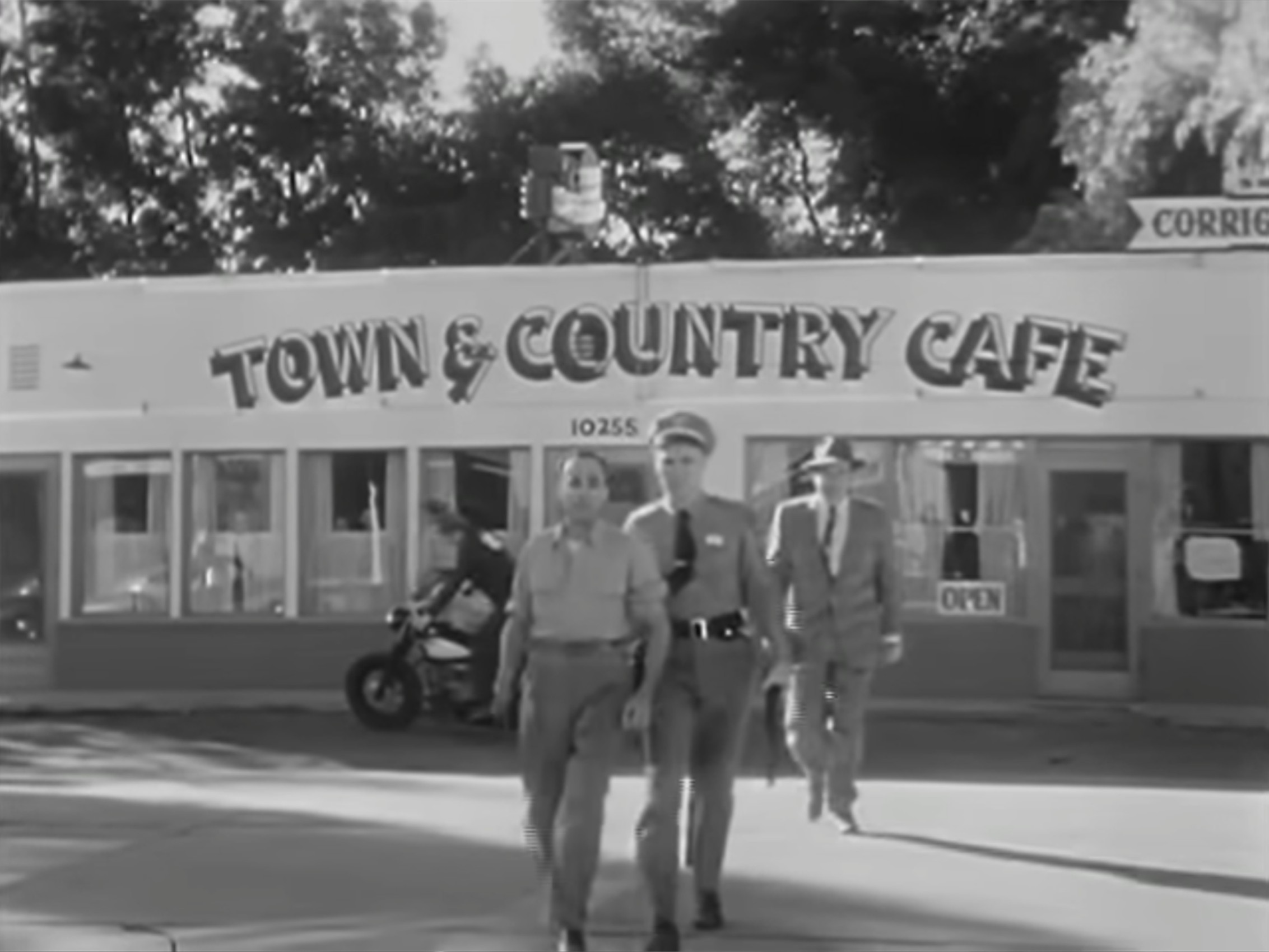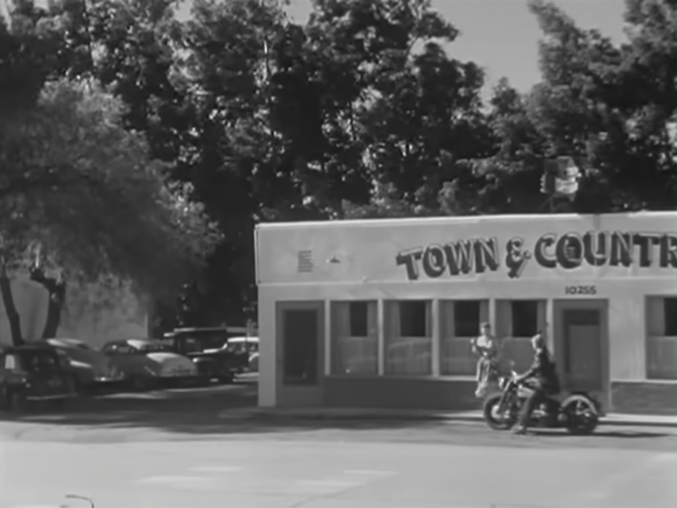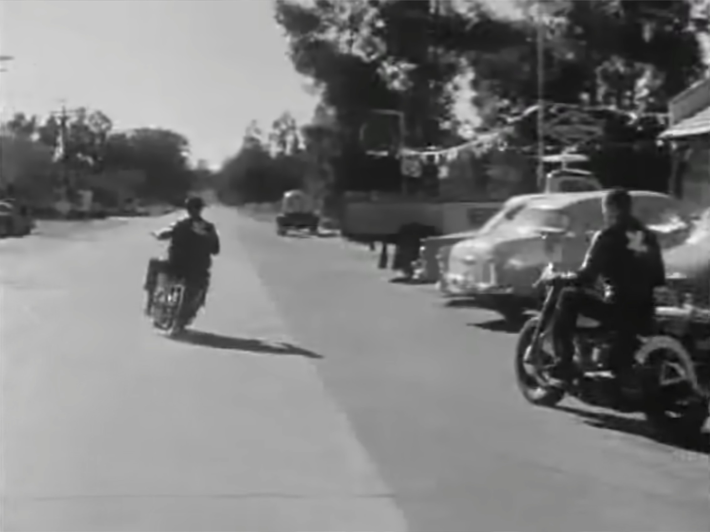 In an episode of the 1950s television show Highway Patrol, aired 2 April 1956, two motorcycle club members (Clint Eastwood as ‘Joe Keeley’ and John Compton as ‘Nick West’) ride their stripped-down Harleys into a small town and stop at a café for breakfast. They are shocked when the café owner (Jack Edwards as ‘Bernie Sills’) confronts them with a shotgun, forces them outside and orders them to leave.
