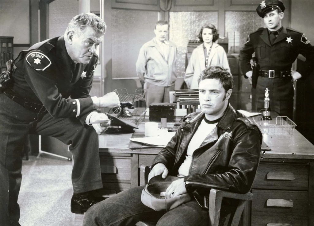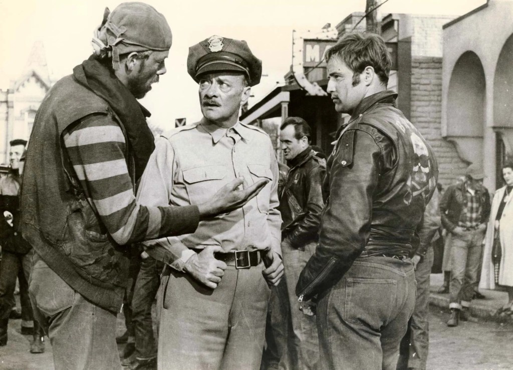 Back in his squad car, however, Mathews questions the café owner’s story — he doubts two bikers would take on an entire town — and tracks them down solely to question them as possible witnesses. When he hears their version of the morning’s events, he is incensed that Sills lied to him, so Mathews sets a trap for Sills. He outfits one of his motor patrolmen with a customized Harley and a borrowed motorcycle club jacket, and sends him into town to stop at the café.