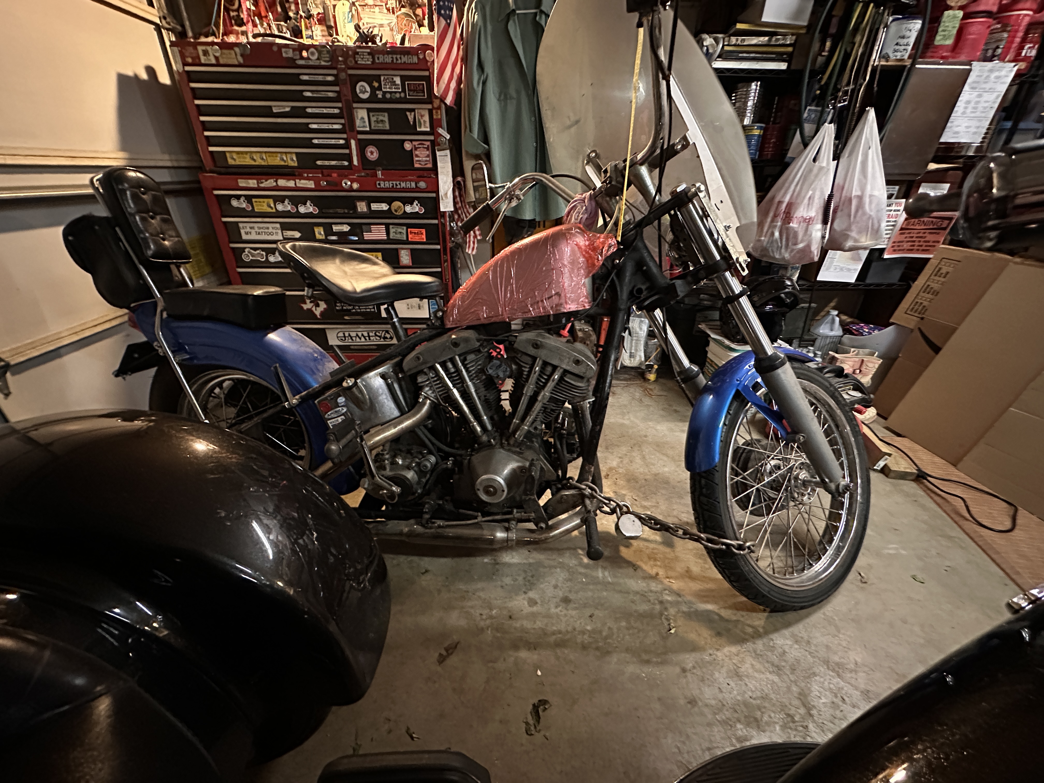 Even in my bolted and alarm-secured garage, my bikes are locked up. I worked hard to get and keep that shovel, and the FLRT parked beside it, and I’m not taking any chances on either of ’em going walkabout. Not on my watch! 😏