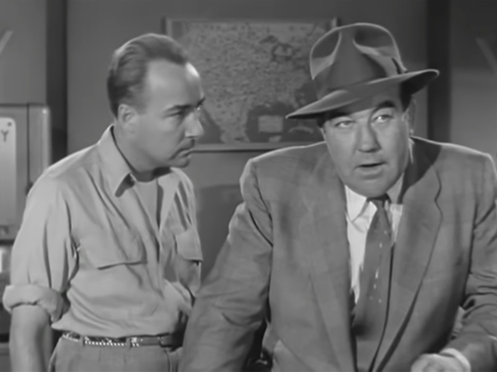 ‘Captain Dan Mathews’ rolls his eyes at Bernie Sills, who is vehemently insisting that ‘those cycle bums’ are responsible for the patrolman’s crash.