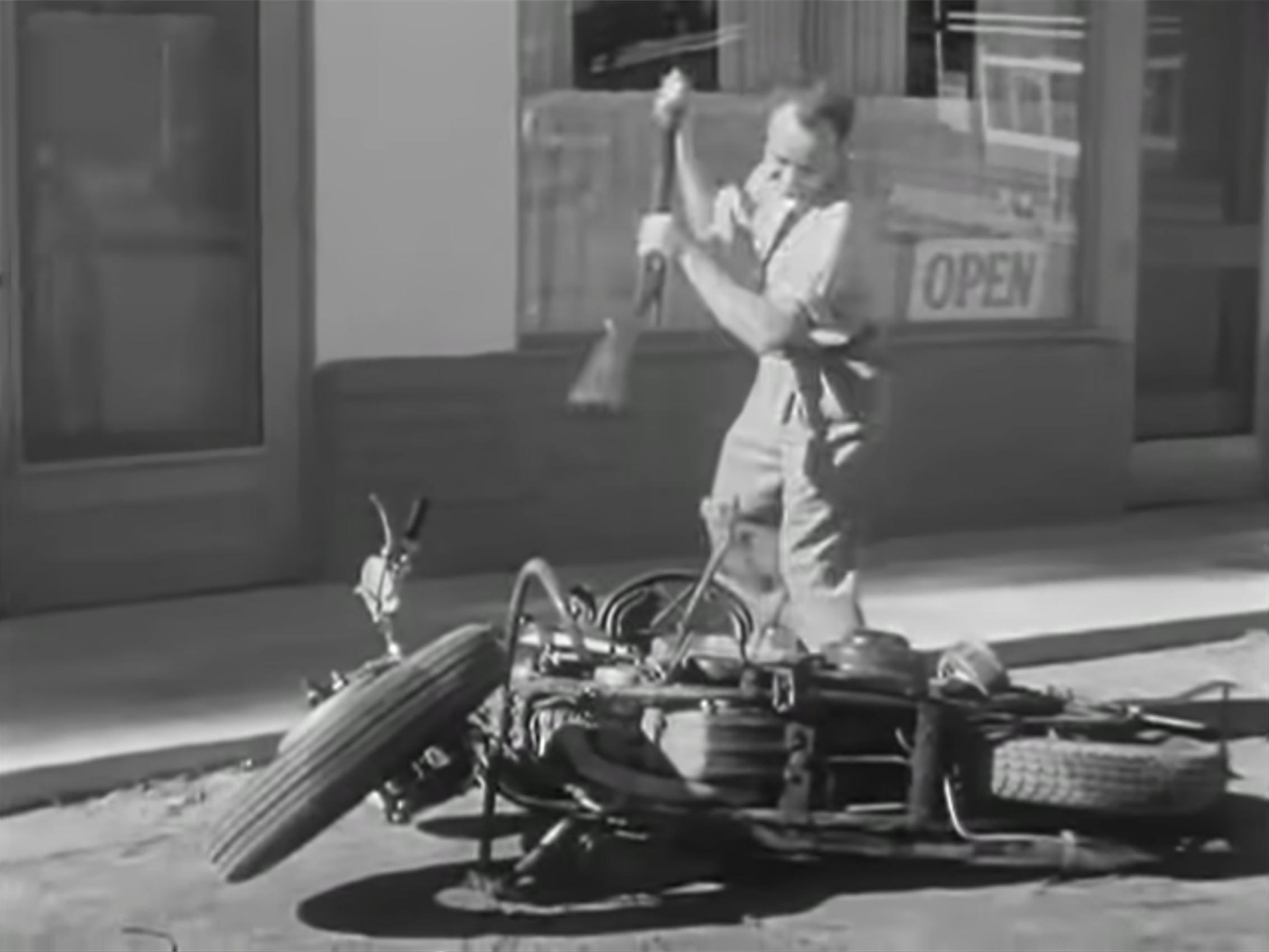 Sills vents his rage on the patrolman’s motorcycle, not realizing that Dan Mathews is watching from across the street.