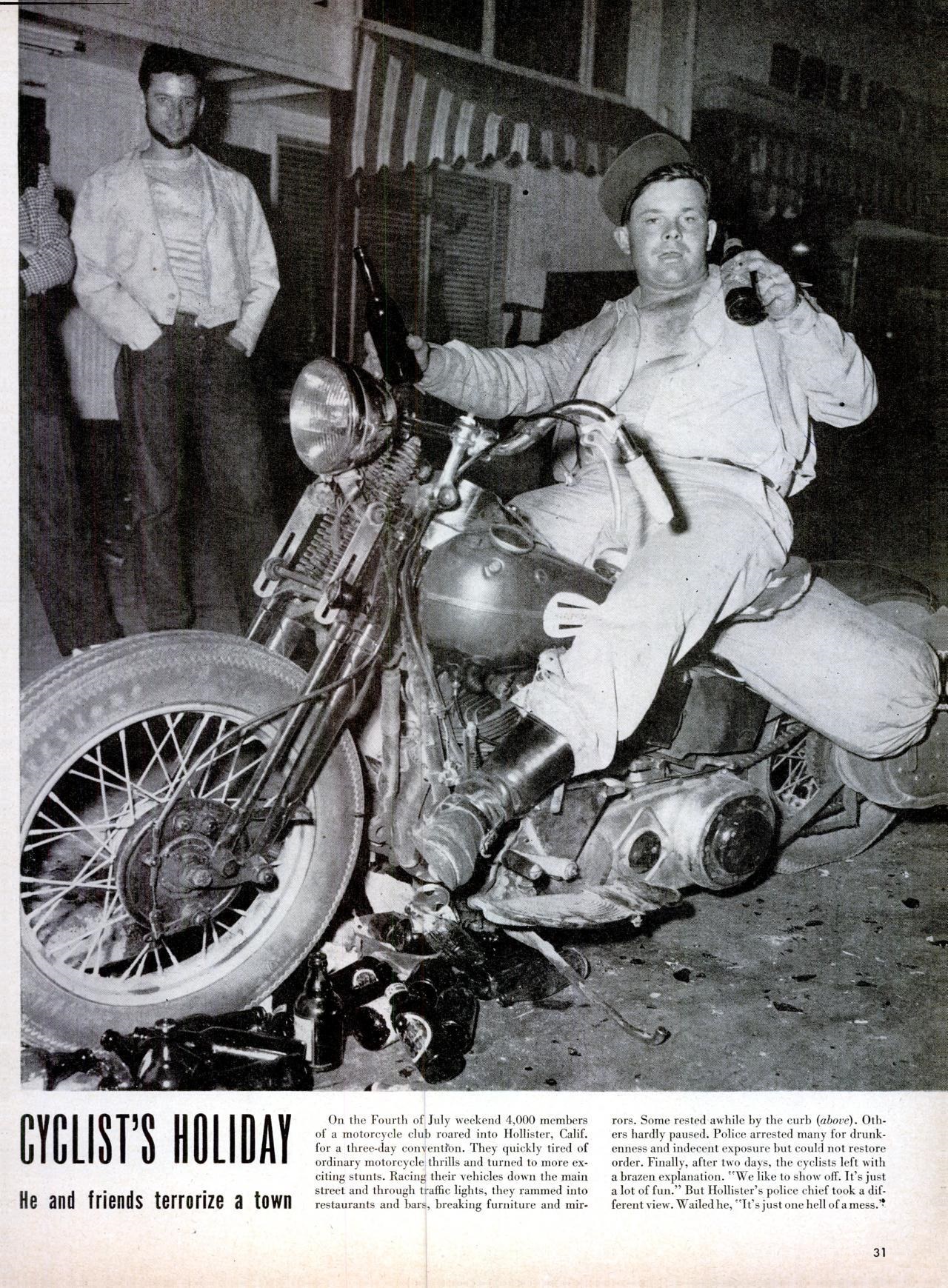 The resulting photograph appeared in LIFE magazine two weeks later, and seared the image of bikers as drunken louts and ruffians into the consciousness of Americans from coast to coast. Similar shenanigans at a rally the following summer, in Riverside, California, cemented that image.