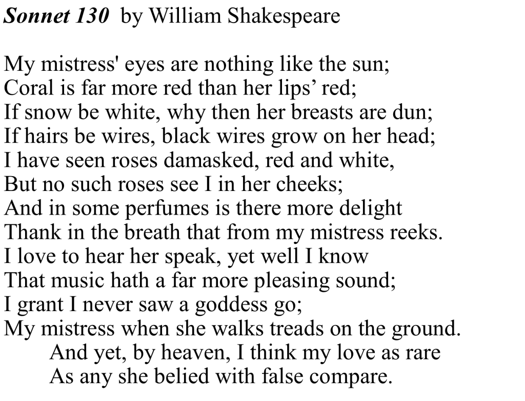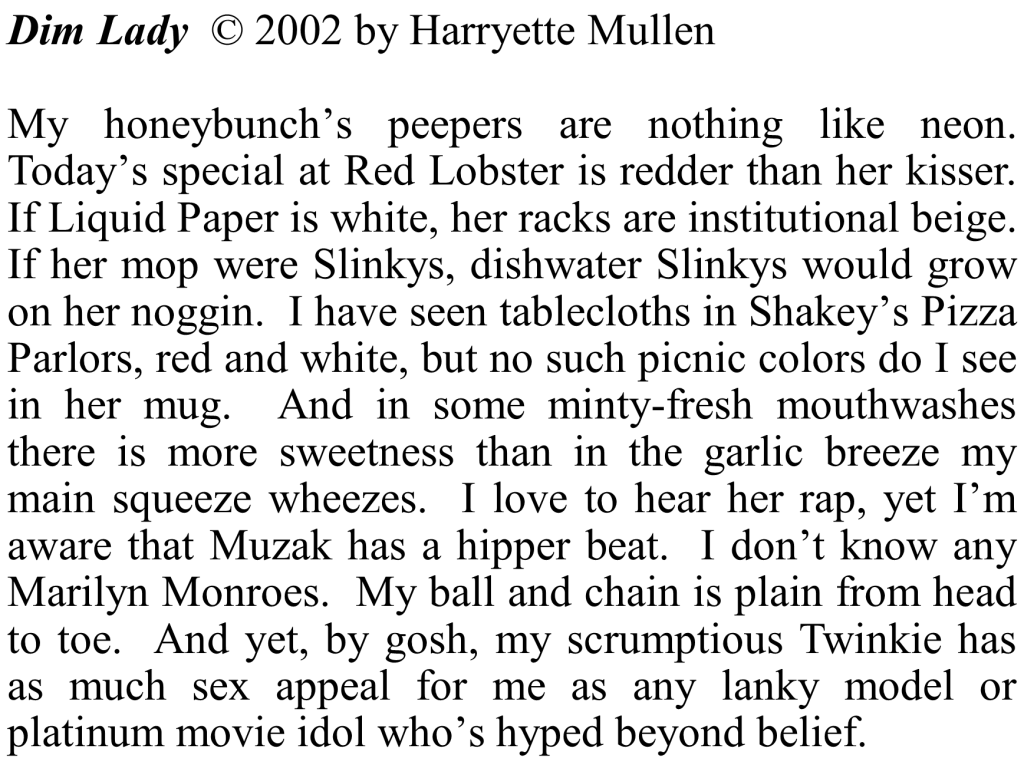 We followed that up with a modern-day retelling of the sonneteer’s great love by poet Harryette Mullen, from her book Sleeping with the Dictionary (2002, University of California Press, Oakland).