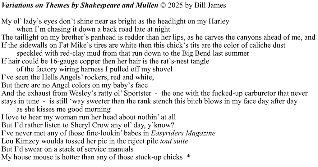 First; I really have never met any of the models from Easyriders, and have no idea what kind of women they are. The characterization is used here only for effect, in keeping with the narrator’s ‘voice’, and does not reflect my own or The Shovel Shop‘s opinion of said models.