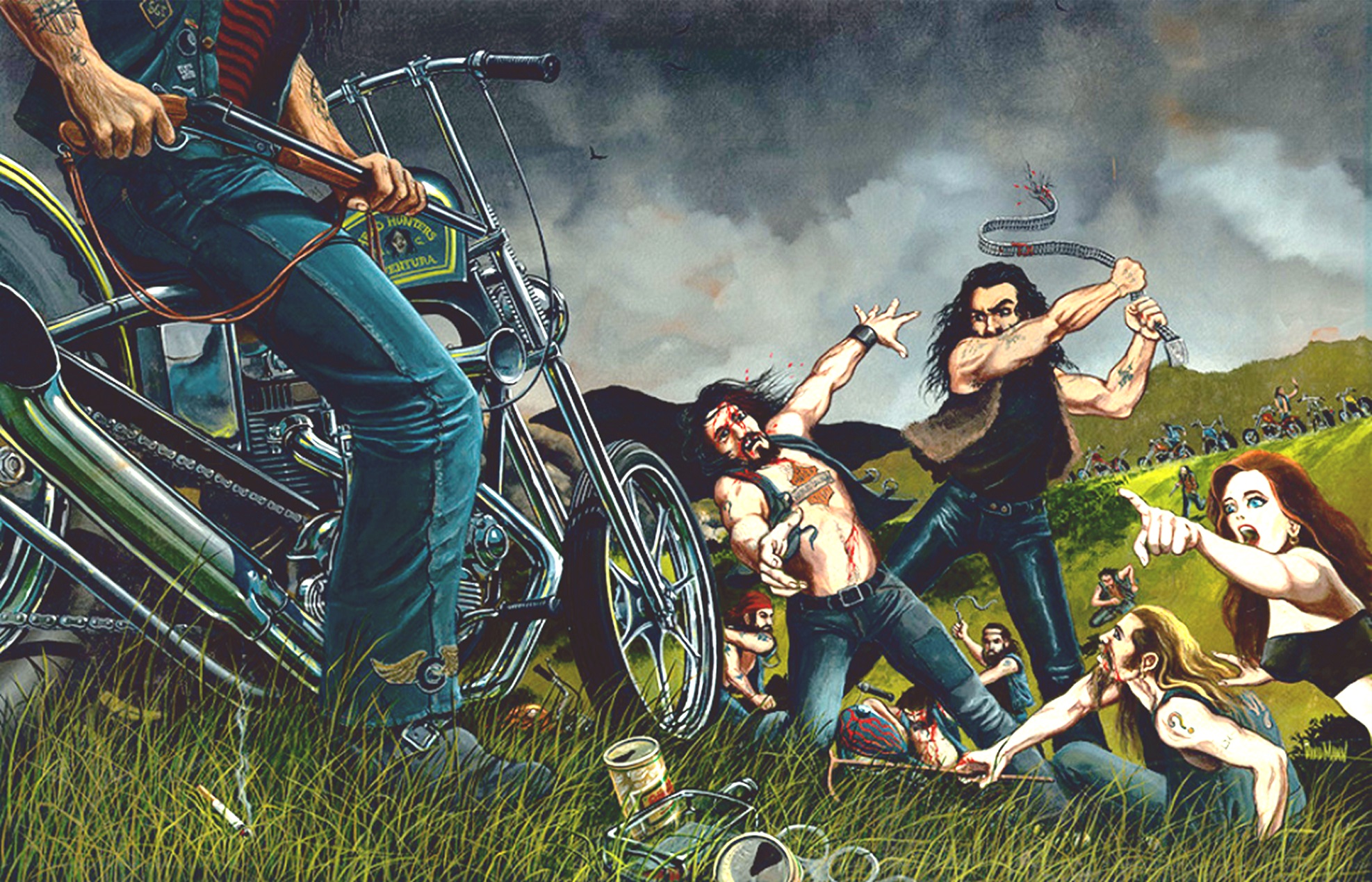 Most noteworthy of these was the godfather of chopper art, David Mann, who first broke out with a series of posters painted for Ed ‘Big Daddy’ Roth of Choppers Magazine fame. Mann created his first masterpiece centerfold painting for Easyriders‘ third issue in October, 1971. The artist – the Frederic Remington of the biker world – painted large centerfold paintings for the monthly magazine, and story illustrations, even as he cranked out book covers, centerfolds and illustrations for other publications. Despite that workload, the artist produced at least one piece for every issue of Easyriders from October, 1971 until his retirement in June, 2004. David Mann passed away in September of that year, but his paintings continued to appear in Easyriders and her sister publications for years afterward.