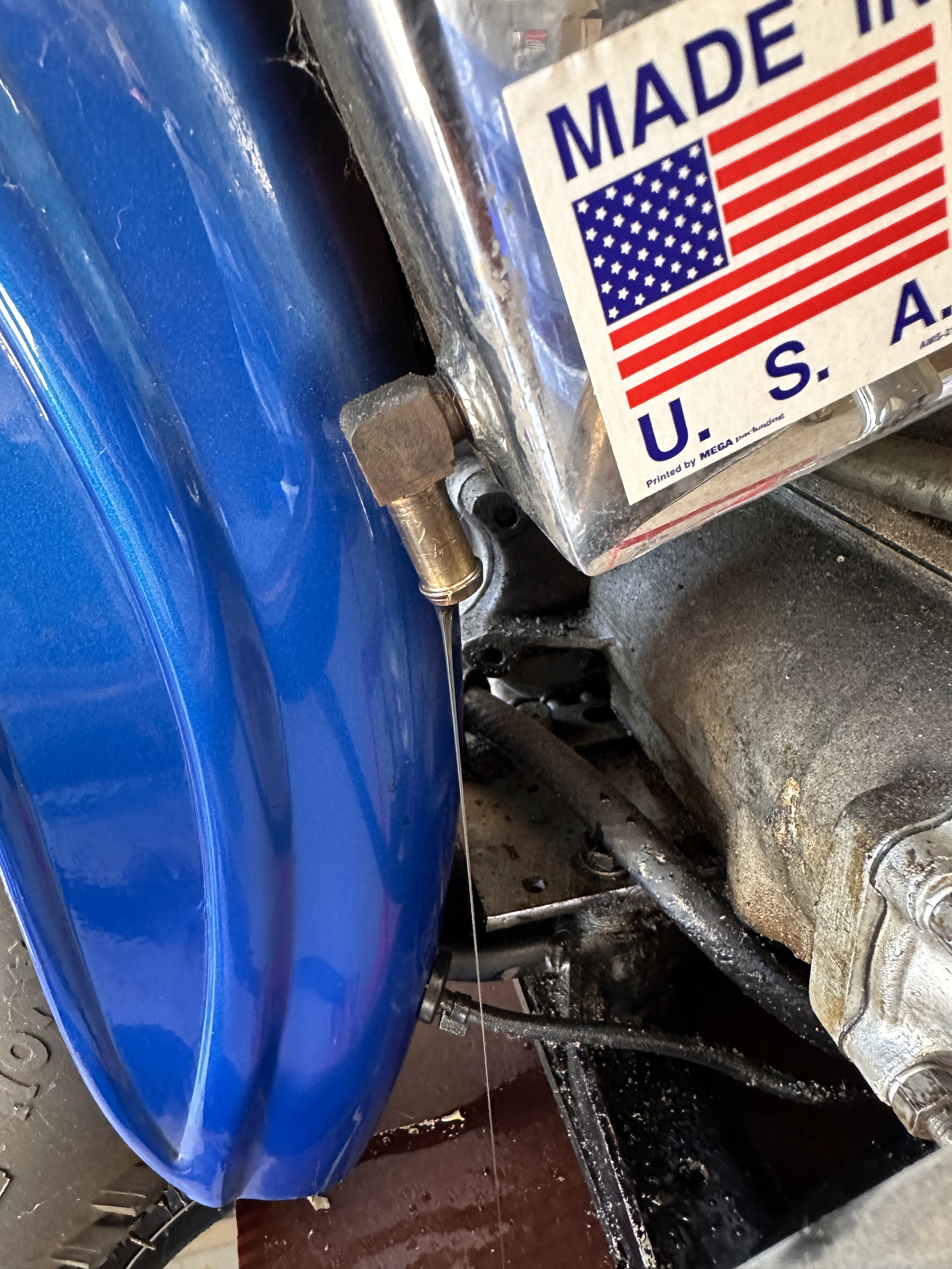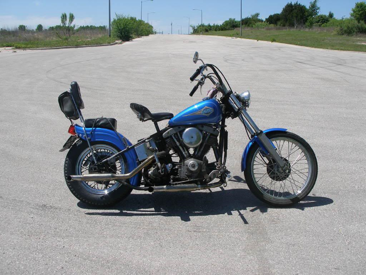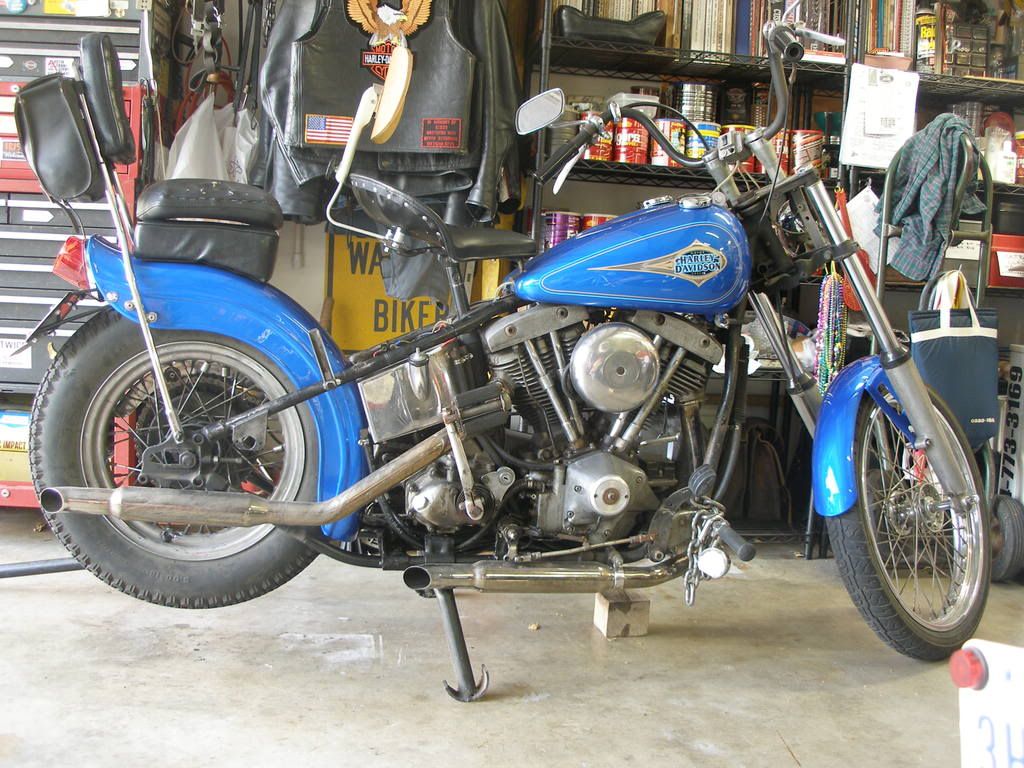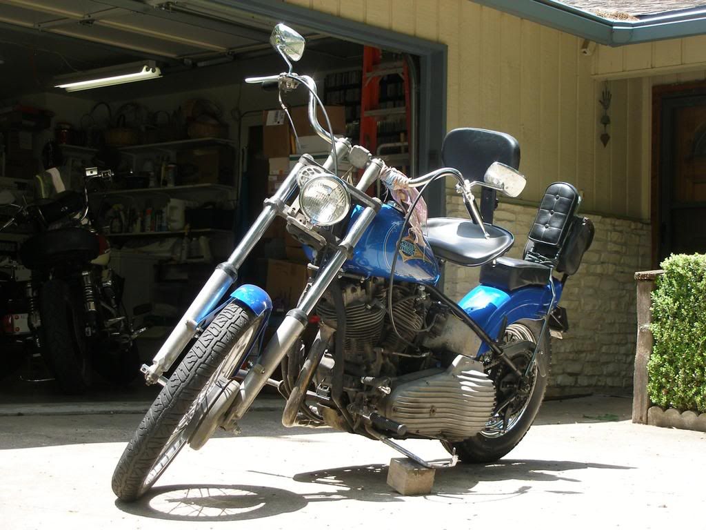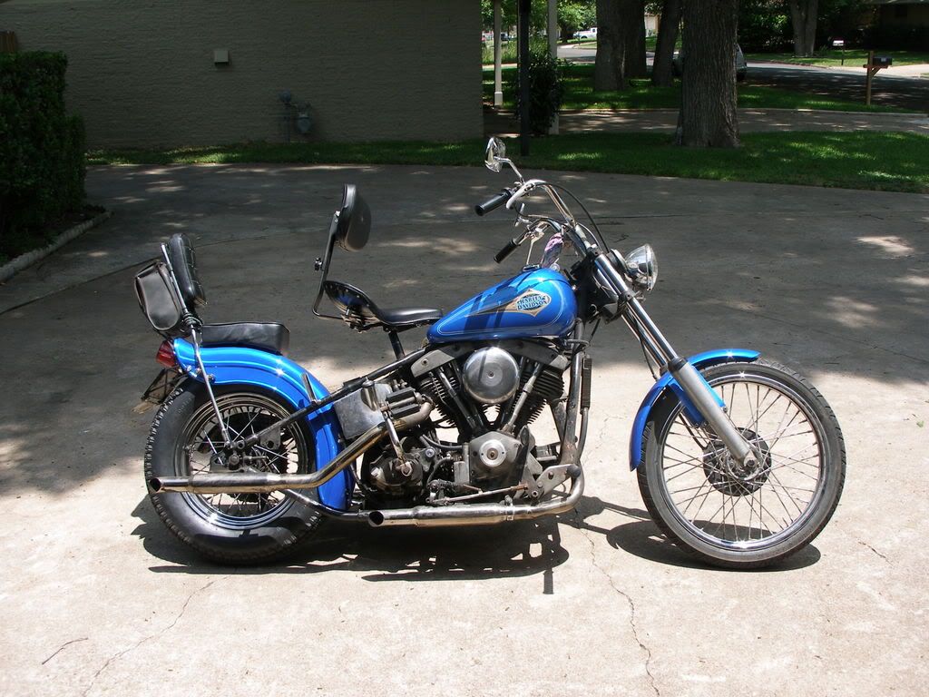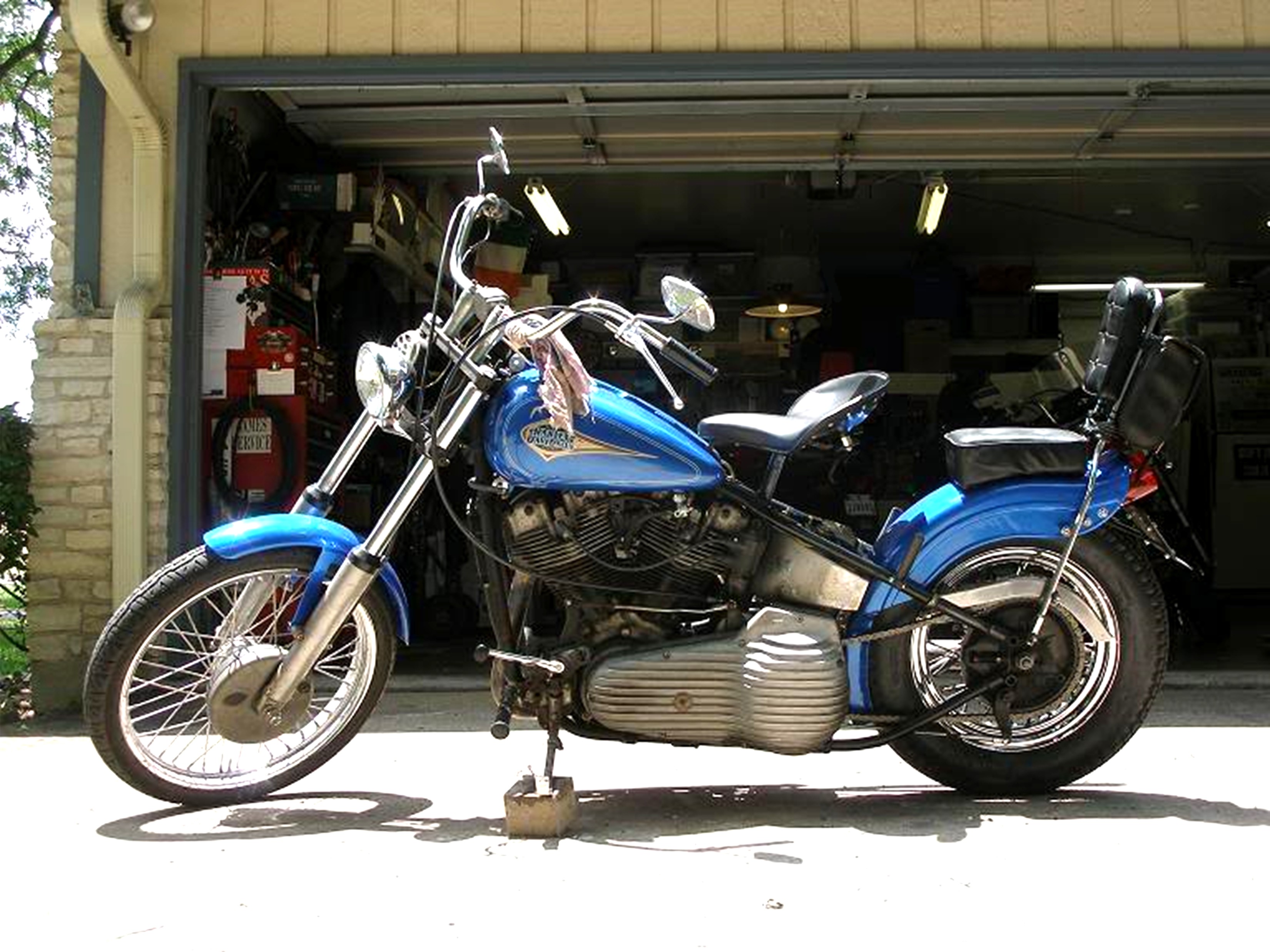 Late model flatside fatbobs in a factory blue, with my old bobber fenders painted to match. Since they were Bud’s final gift to me, I am reluctant to mess with the paint scheme.
