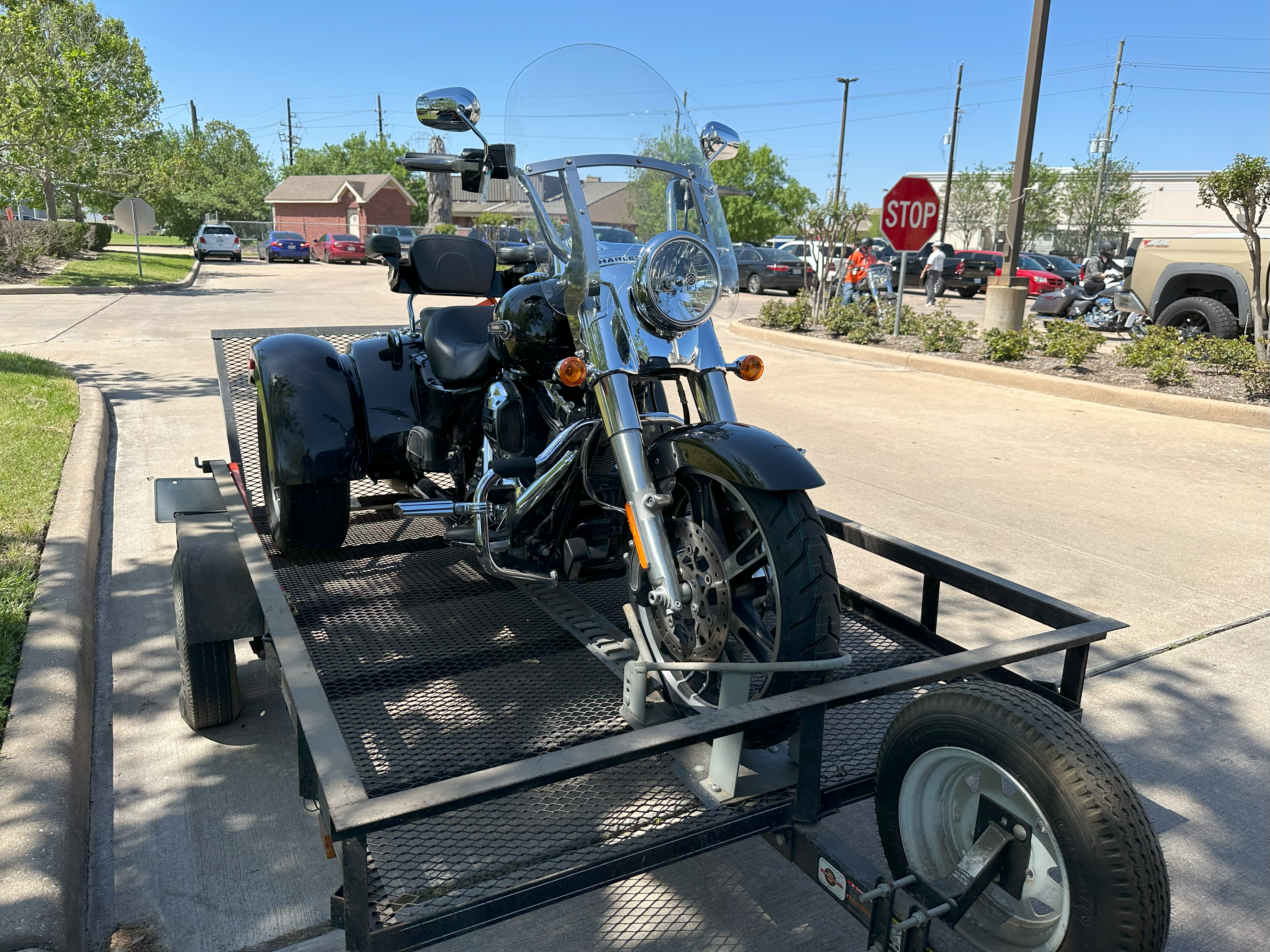By now I was getting desperate to get back in the wind, so I gave up and I gave in, and I went shopping for a Harley-Davidson Freewheeler. Of the late-model trikes on offer from the MoCo, the Freewheeler was closest to my idea of a motorcycle. It was a little stripped down, a little meaner looking than the Tri-Glide, and quite a bit lighter. It still weighs twice what my shovel does 😮 but that fiberglass taco box is heavy!