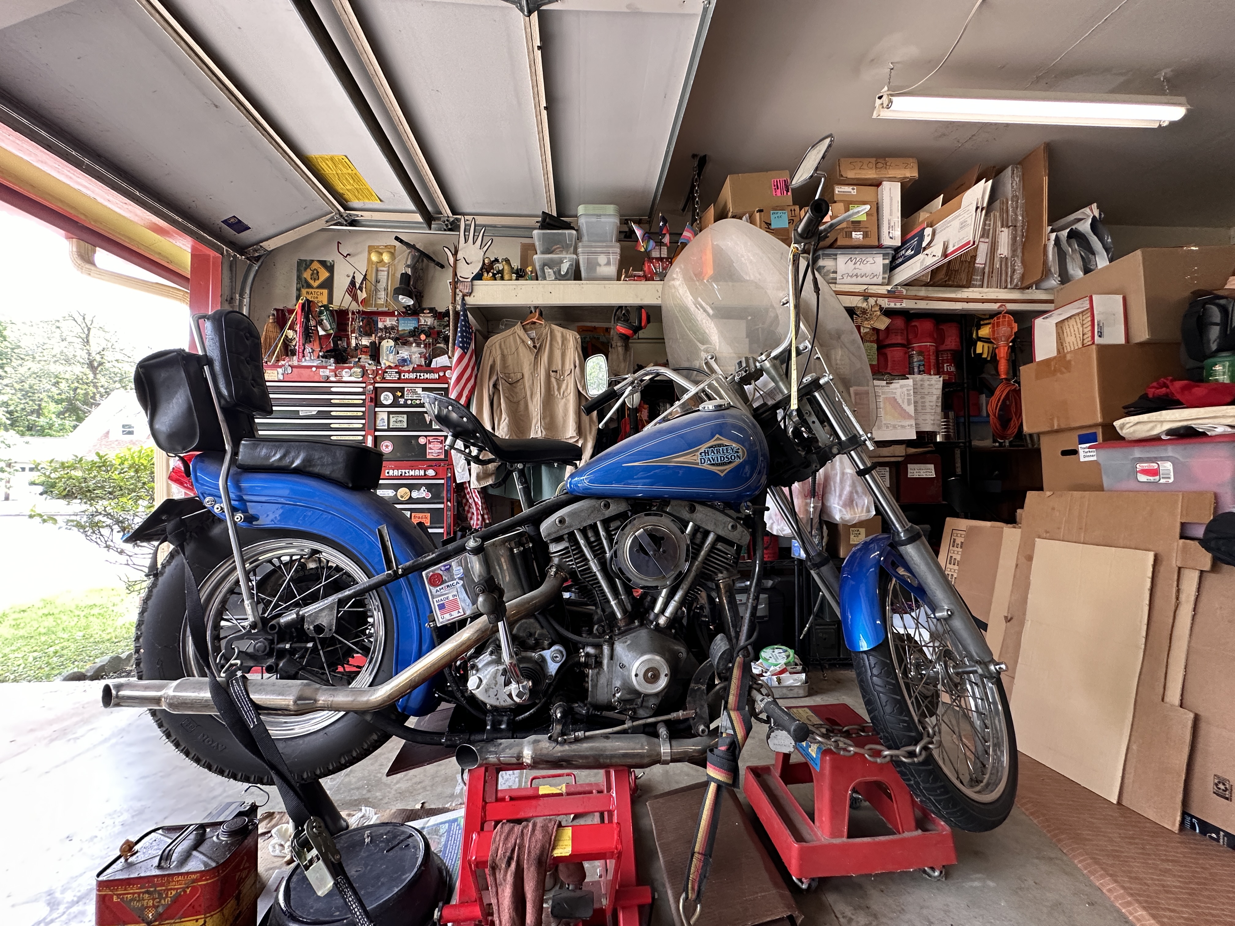 The first word I ever read as a child was SHELL. When I saw this aging service station during a motorcycle trip in 2019, I whipped around and went back for a photo. This is either in northern Kentucky or southern OhioIn 2021 Ernie Barkman crafted this seat rail for me and the Shovelhead’s official name became Atomic Shovel.I have graduated to hacking up other people’s motorcycles. This was another parking lot repair in 2021 on fellow vintage motorcycle rider Marjorie Kleiman’s Harley-Davidson FXR. Photo by Marjorie Kleiman.