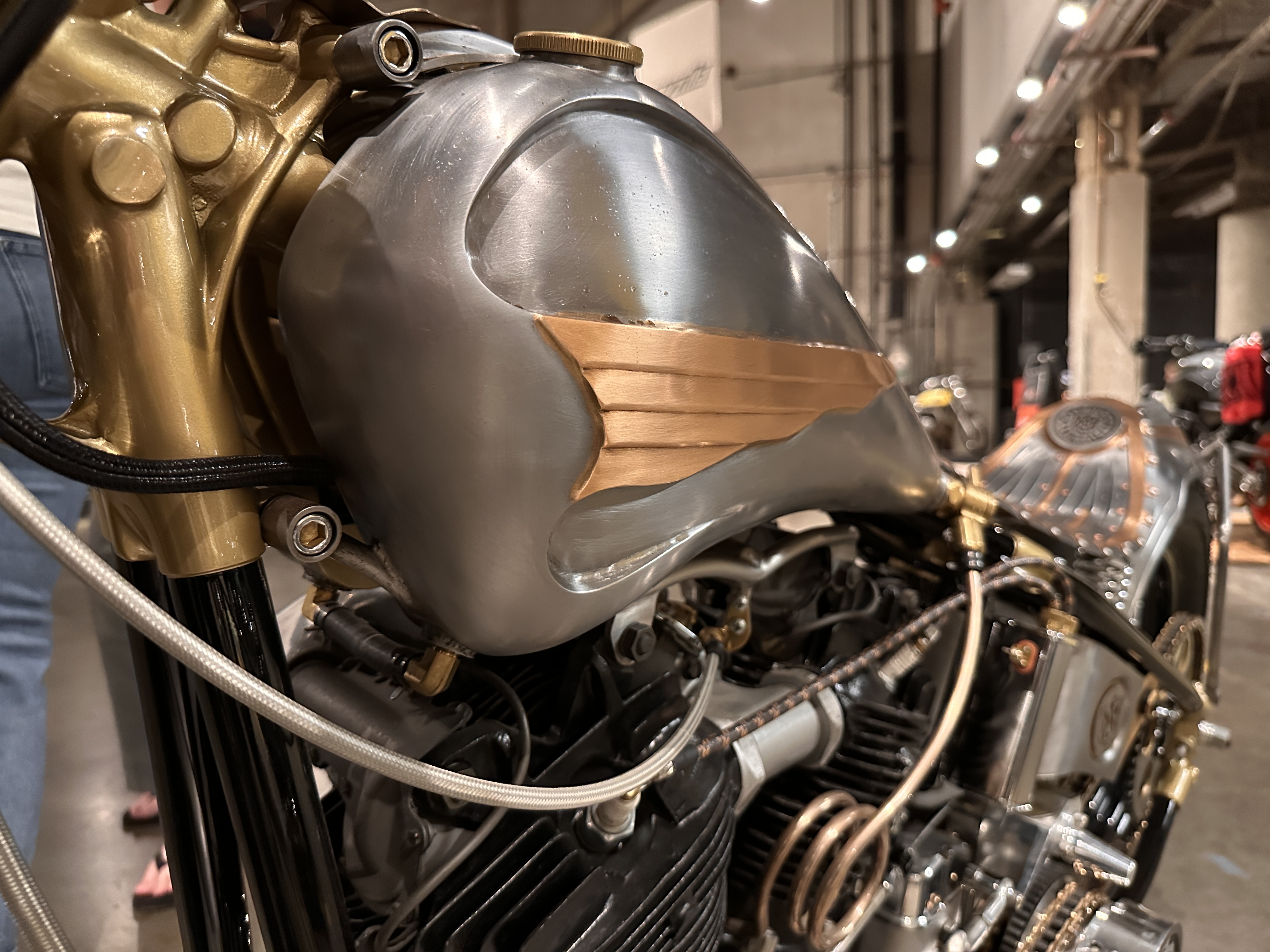 However, the way the flat-side bobs mount to the frame prevented us from using the traditional t-bar. Instead, Harley Bob, one of Bud’s ace mechanics and welders, had to relocate the front mounting point for the t-bar, and then heat and bend my t-bar to make it fit. I topped that off with a traditional OEM leather tractor seat saddle; the one Harley-Davidson had been using since 1923. I actually bought it from the local Harley dealership, no less!