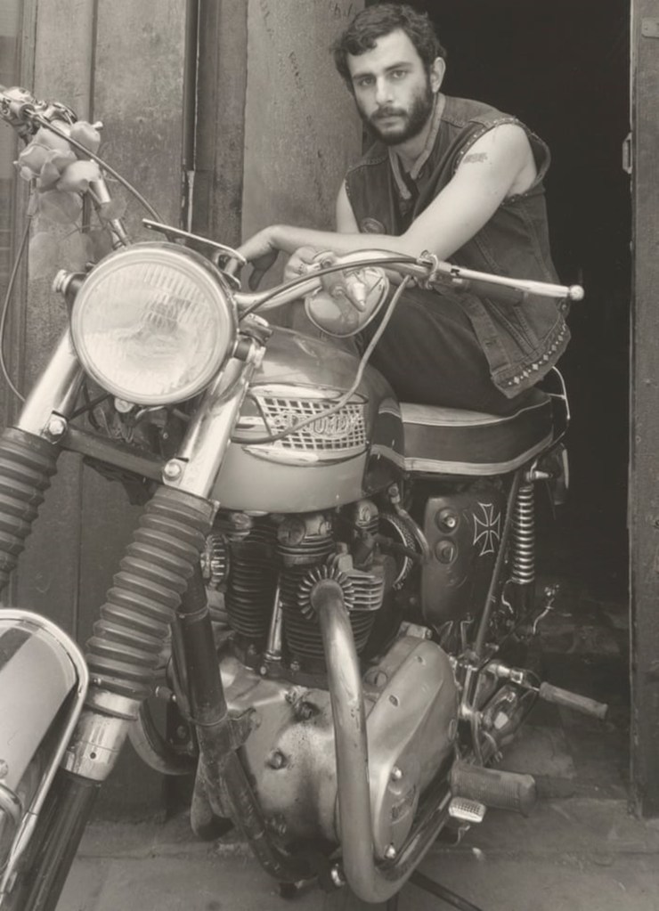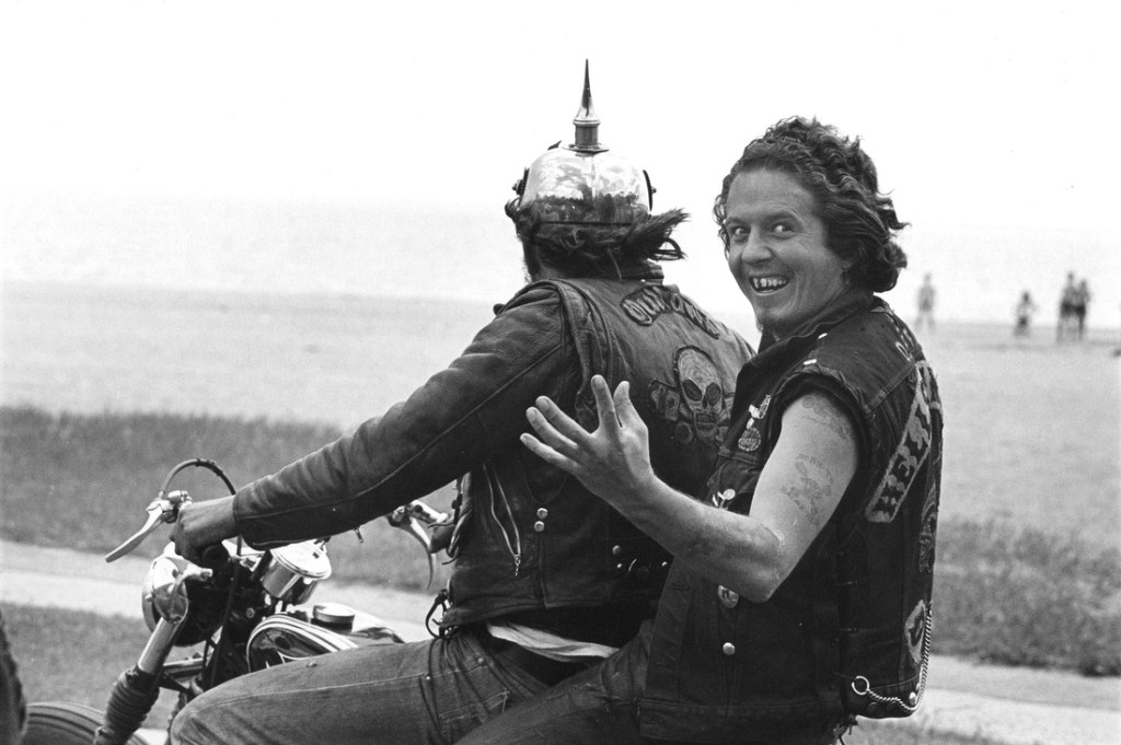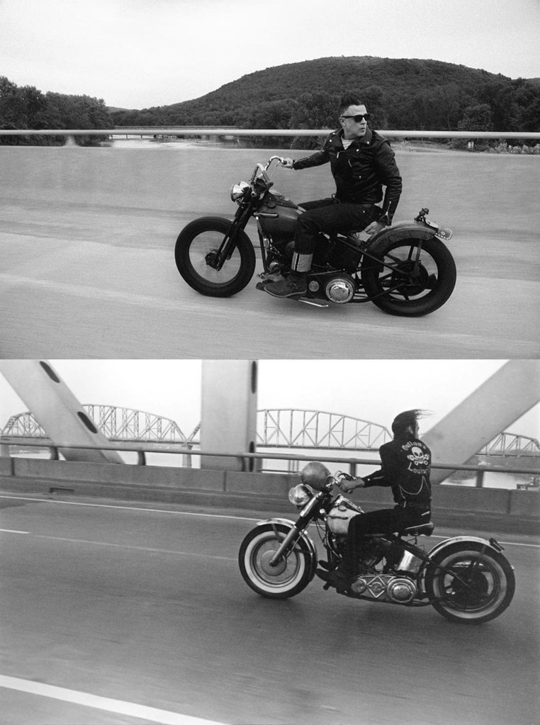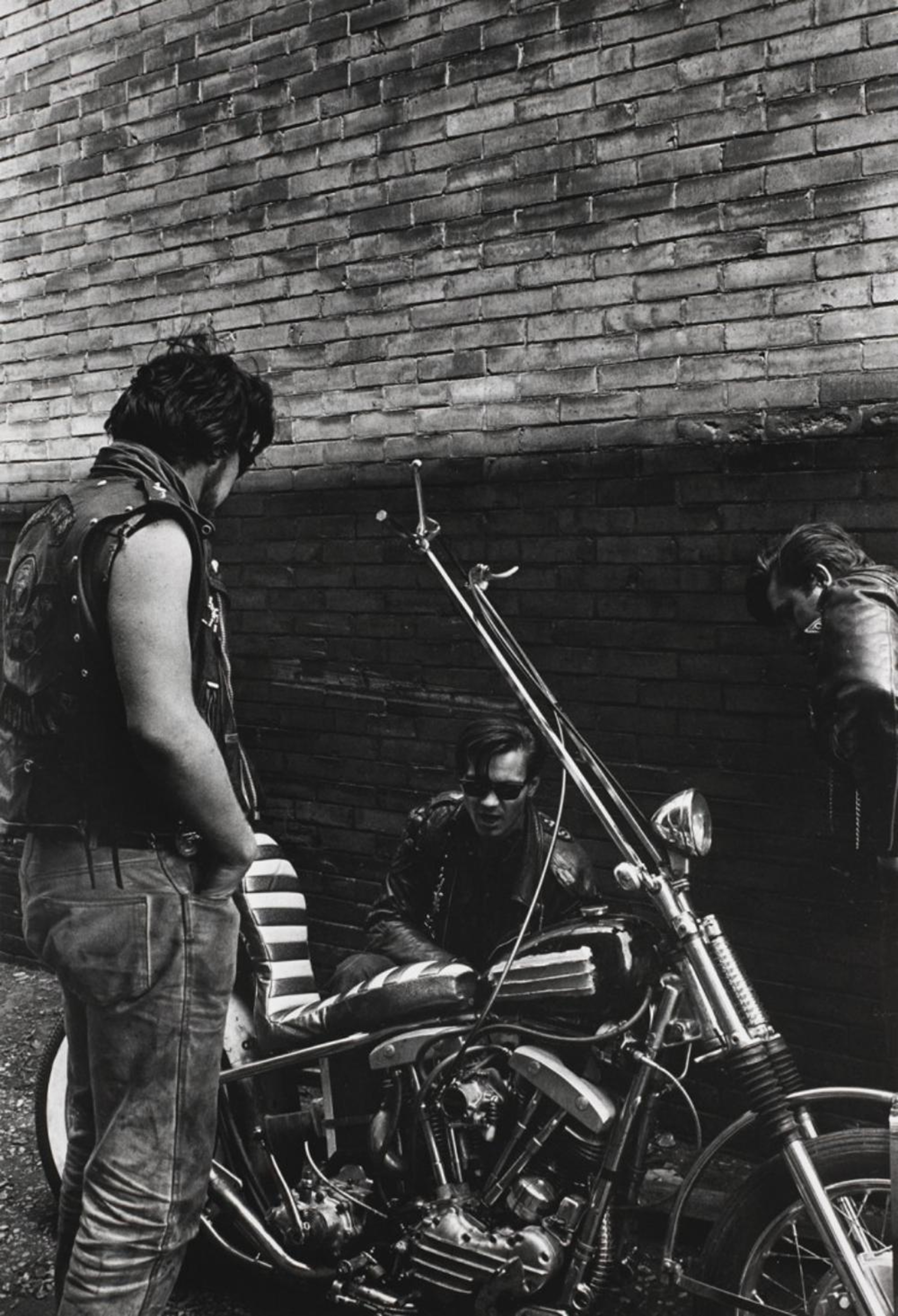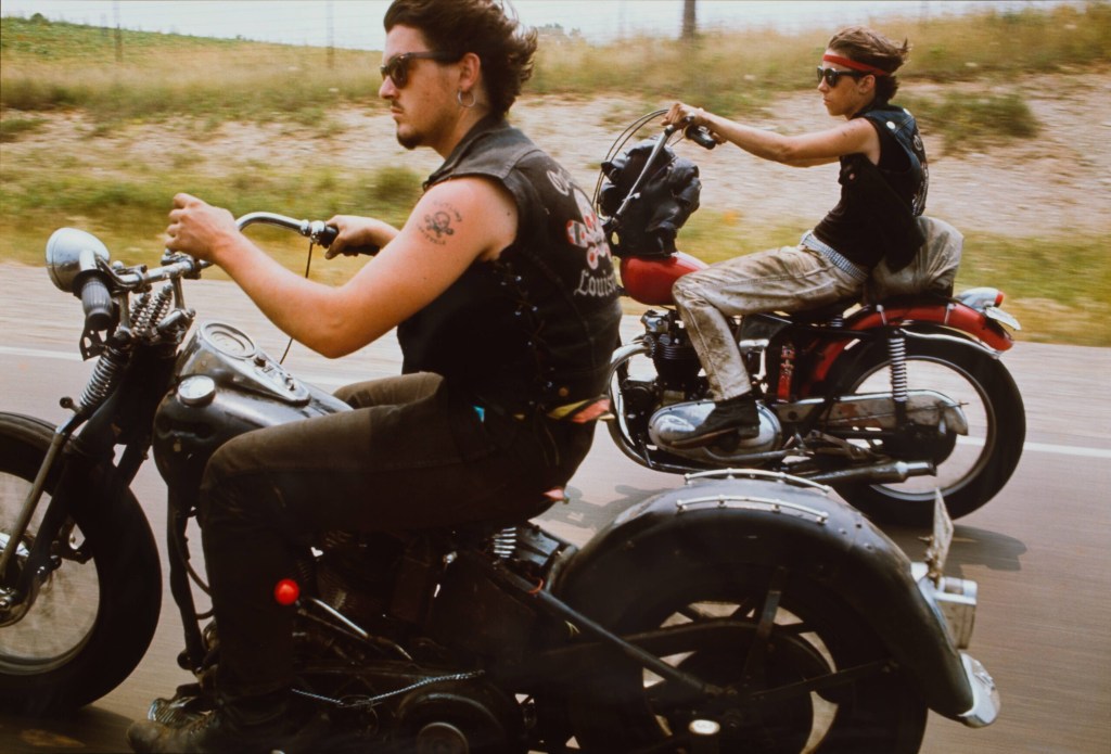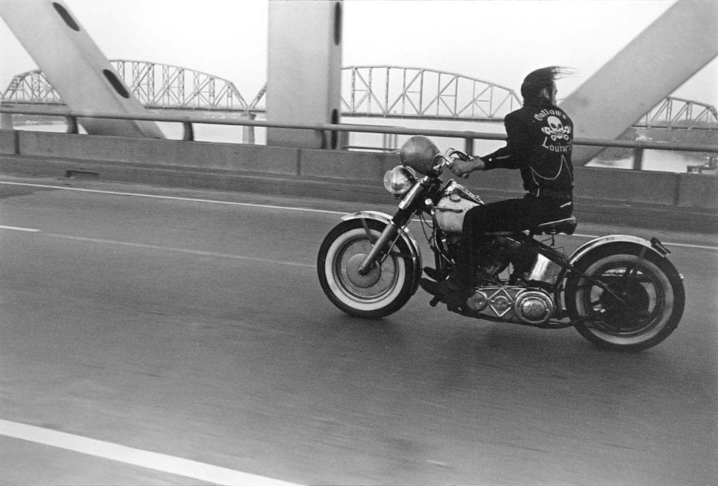 And, of course, there were hundreds and hundreds of pics of bikers, male and female, outlaw and straight, on original or restored classics or wild-as-fuck radical customs. They were jamming down the road, hair floating in the breeze and tight grins on their faces, or scowling at the camera and flipping the universal biker salute – one raised finger – to friend and foe alike. They were drinking beer, wrestling in the mud of a campsite, or tearing a motorcycle apart beneath a tree as friends gathered to offer assistance….
